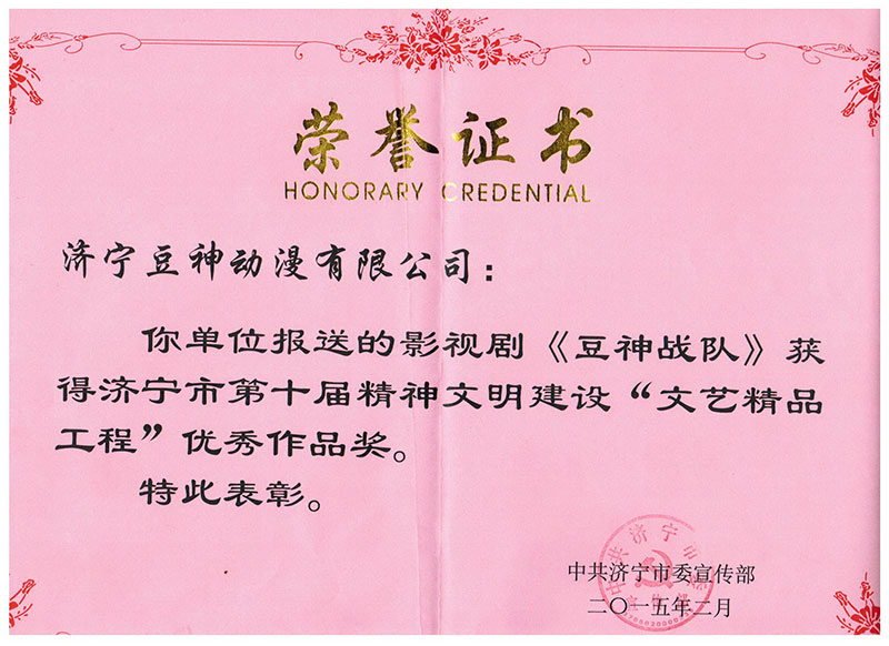 祝賀《豆神戰(zhàn)隊(duì)》2015年1月榮獲濟(jì)寧市第十屆精神文明建設(shè)“文藝精品工程”獎(jiǎng);