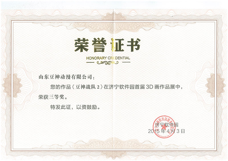 《豆神戰(zhàn)隊(duì)》2015年4月《豆神戰(zhàn)隊(duì)1》和《豆神戰(zhàn)隊(duì)2》分獲濟(jì)寧軟件園首屆3D畫作品展三等獎