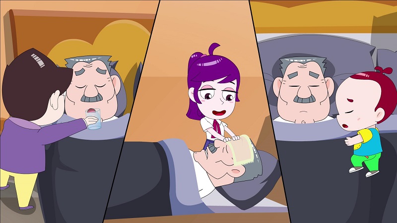 大爸爸發(fā)現(xiàn)后,給三人明確分工,大爸爸給爺爺量體溫,菲菲給爺爺擦額頭,多寶乖巧的陪爺爺睡覺,在大家的照顧下,爺爺一覺醒來,病就好了。