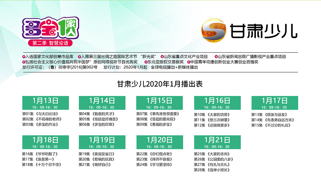 深受小朋友們喜愛的系列動(dòng)畫片《多寶一家人》第二季智慧論語將于1月13日在甘肅少兒頻道開播。這是一部由山東豆神動(dòng)漫有限公司制作、出品的優(yōu)秀原創(chuàng)系列動(dòng)畫片。