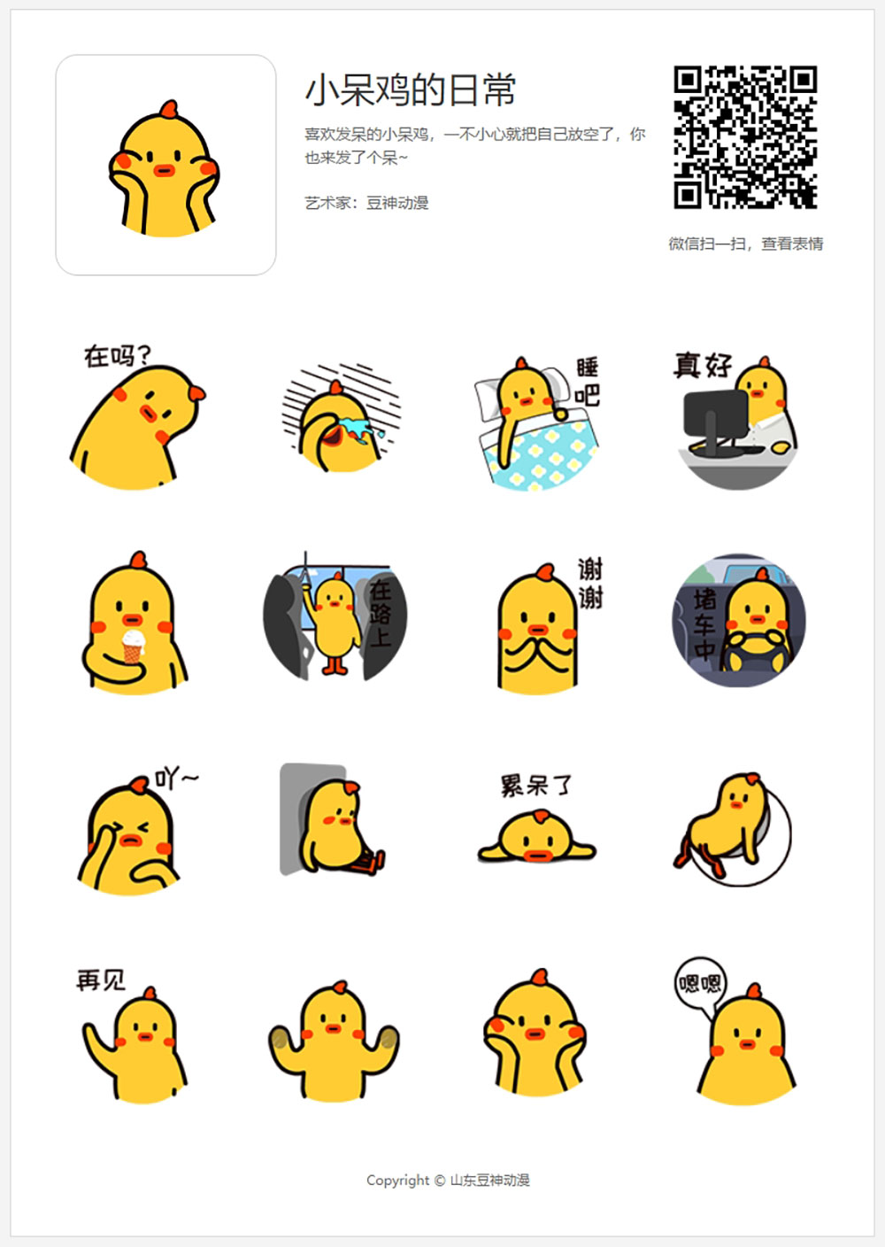 小呆雞作為原創(chuàng)形象IP,倡導(dǎo)的是一種感知當(dāng)下,活在當(dāng)下的生活理念。2018年2月23日首次發(fā)表于微信表情平臺,之后在騰訊動(dòng)漫、微博等平臺陸續(xù)更新,短片動(dòng)畫也在加急制作中。